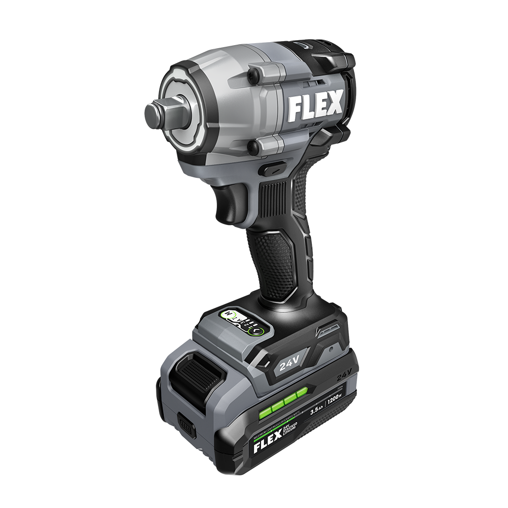 The FLEX 24V 1/2” Compact Impact Wrench packs big power into a compact size so you can power through the day with a lightweight, durable tool built to conquer hard-to-reach spaces. This compact cordless impact wrench is 38 percent lighter than its larger counterpart, FX1451, and an ideal tool for automotive and framing applications. This powerful 1/2-inch impact wrench delivers 300 foot-pounds of fastening torque and 450 foot-pounds of nut-busting torque for demanding jobs. When tightening or loosening bolts and lug nuts, Bolt Auto Stop Mode prevents over-tightening, breaking, or stripping the bolt while Bolt Removal Mode stops the tool when it senses the bolt is loosened. Screw Mode delivers faster speed for wood-driving applications like driving SDS screws into pine or LVL. Its 360-degree LED lights up dark areas with five adjustable brightness settings. The ergonomic design and soft-grip handle paired with a variable speed trigger deliver ideal balance, comfort, and total control. This compact impact wrench dominates with the FLEX Stacked Lithium Advantage: unmatched battery power, runtime, and charging capability. The impact wrench set includes the ½-inch impact wrench, a 3.5Ah Stacked Lithium battery, and 160W Fast Charger.