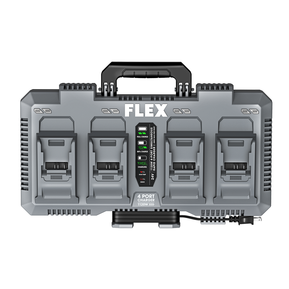 The FLEX 1120W 4-Port Simultaneous Rapid Charger is a multitasking powerhouse, fully charging up to four batteries at the same time at 280W per port in as little as 30 minutes. Its Smart Charge Gauge indicator lights allow you to easily monitor charging levels, and the durable design of its Battery Lock System prevents accidental disconnection during recharging. The charger is compatible with select FLEX Stack Packâ„¢ storage solutions for easy organization and transportation to and from the jobsite. And it’s all