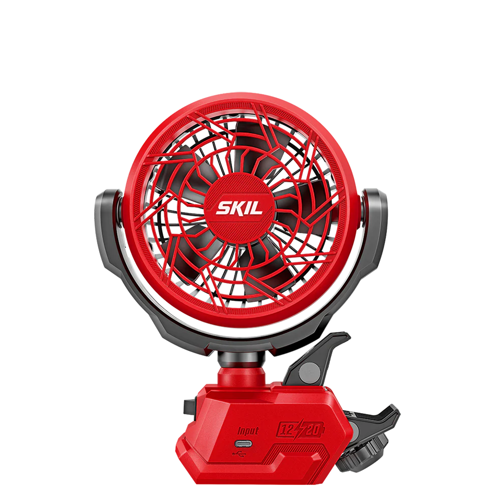 The SKIL 12V/20V Brushless 4 In. Clamp Fan can be powered by either PWRCORE 12™ or PWRCORE 20™ batteries. It also offers a hybrid AC option to be powered via USB-C. This convenient, compact clamp fan delivers powerful airflow up to 200 CFM with airspeeds up to 11 MPH. Its industrial threaded clamp provides strong holding capacity. This cordless fan is built for tight spaces or easy on-the-go use, and its multidirectional pivoting and swiveling head can send air where you need it. It runs up to 14 hours on low when powered by a PWRCORE 20™ 2.0Ah 20-volt battery or up to 8.5 hours on low with a PWRCORE 12™ 2.0Ah 12-volt battery (batteries sold separately).