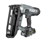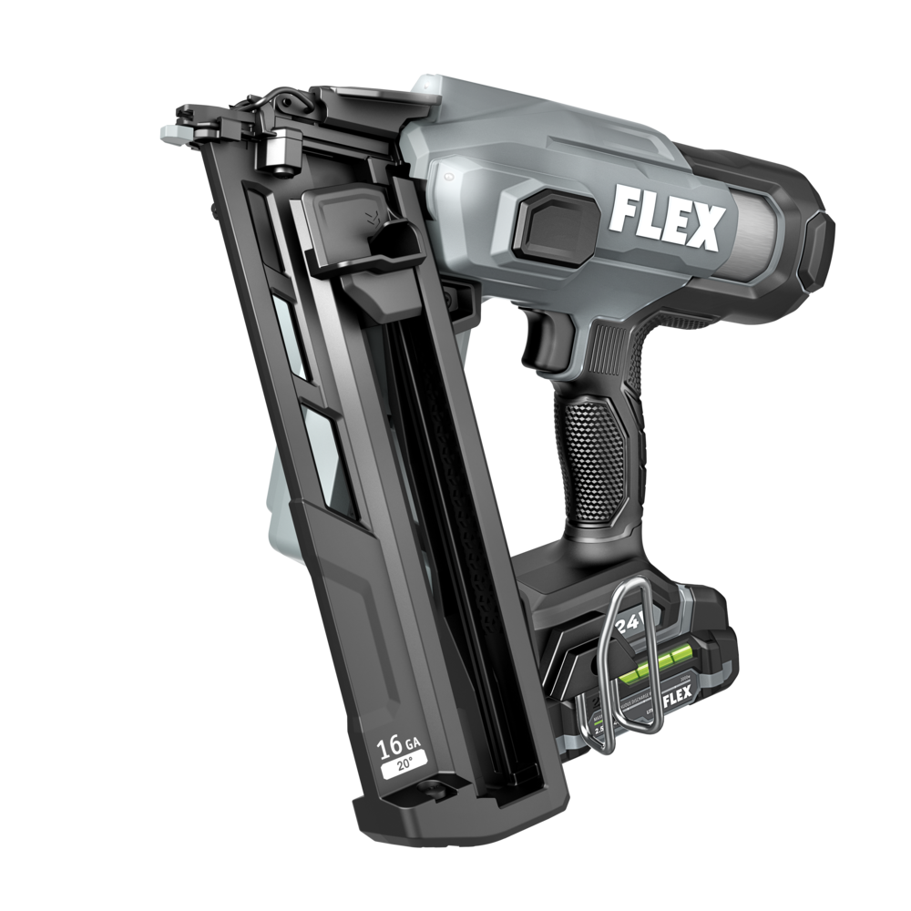 Power through moulding and trim installation with the FLEX 24V Brushless 16Ga Angled Finish Nailer. This cordless finish nailer delivers high-speed power by driving up to 3 nails per second with zero ramp up time. It drives up to 1,500 nails on a single charge with a 2.5Ah lithium-ion battery for extended runtime. The nail gun features an ergonomic quick depth adjustment lever to easily set the ideal nailing depth when driving fasteners, and its triple LED light delivers shadow-free illumination for better visibility in dark work areas. The cordless nail gun toggles between bump and sequential firing modes and has a nail indicator to easily see how many nails remain in the magazine. Dry-fire lockout avoids blank firing and damage to your work when the nail supply is exhausted. Tool-free jam clearance allows you to quickly clear jammed nails without tools for maximum efficiency when you’re on the job. The cordless nailer is compact and lightweight to conquer tight spaces with minimal fatigue. Its heavy-duty belt clip can be mounted on either side of the tool and features a lead-in profile. The finish nailer accepts 1-1/4-inch to 2-1/2-inch 16-gauge fasteners. This cordless nailer delivers the FLEX Advantage of unmatched battery power, runtime, and fast charging. Kit includes the 16Ga Angled Finish Nailer, 2.5Ah lithium battery, 160W Fast Charger, belt clip, (3) no-mar tips, and a FLEX bag.