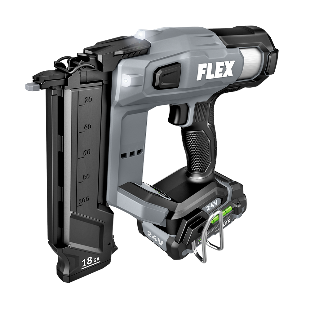 Power through finishing jobs without the hassle of hoses and compressors with the FLEX 24V Brushless 18Ga Brad Nailer. This cordless brad nailer delivers high-speed power by driving up to 3 nails per second with zero ramp up time. It drives up to 2,200 nails on a single charge with a 2.5Ah lithium-ion battery for extended runtime. The nail gun features an ergonomic quick depth adjustment lever to easily set the ideal nailing depth when driving fasteners, and its triple LED light delivers shadow-free illumination for better visibility in dark work areas. The cordless nail gun toggles between bump and sequential firing modes and has a nail indicator to easily see how many nails remain in the magazine. Dry-fire lockout avoids blank firing and damage to your work when the nail supply is exhausted. Tool-free jam clearance allows you to quickly clear jammed nails without tools for maximum efficiency when you’re on the job. The cordless nailer is compact and lightweight to conquer tight spaces with minimal fatigue. Its heavy-duty belt clip can be mounted on either side of the tool and features a lead-in profile. The finish nailer accepts 5/8-inch to 2-1/8-inch 18-gauge fasteners. This cordless nailer delivers the FLEX Advantage of unmatched battery power, runtime, and fast charging. Kit includes the 18Ga Brad Nailer, 2.5Ah lithium battery, 160W Fast Charger, belt clip, (3) no-mar tips, and a FLEX bag.