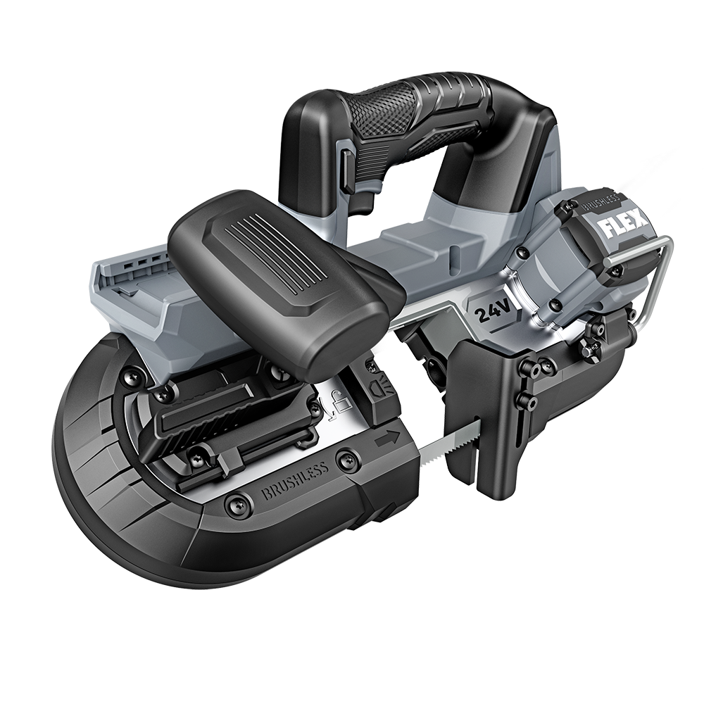 Power through conduit, rod, pipes, and strut with the FLEX 24V 2-1/2” Compact Band Saw. This powerful compact band saw is 27 percent more compact and 43 percent lighter than its larger 5-inch deep cut counterpart, making it an ideal lightweight portable band saw for plumbers and electricians needing to cut material in place while up on a ladder. Its powerful brushless motor delivers fast cutting speeds for clean, burr-free cuts and its variable speed trigger provides better control when cutting through different materials. A quick-release tool-free blade cover protects the active cutting area for added safety during use, and an LED light illuminates dark work areas. A rafter hook allows quick and easy storage from ladders, struts, and FLEX STACK PACK™ rack rails between cuts. This cordless band saw delivers the FLEX Advantage of unmatched battery power, runtime, and fast charging (battery and charger sold separately). It’s
