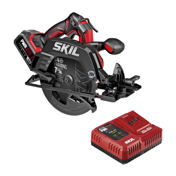 The SKIL PWR CORE 20â„¢ Brushless 20V 7-1/4 In. Circular Saw delivers powerful cutting performance with up to 250 cuts in 2×4 pine on a single charge when used with the included PWR CORE 20â„¢ 4.0Ah lithium battery. Take on demanding jobs and rip through 3X lumber in one pass with the saw’s powerful digital brushless motor, which delivers up to 5,300 RPM for extreme cutting performance. Get smooth and accurate cuts with the included 24-tooth 7-1/4-inch circular saw blade. This SKIL saw features durable construction including cast aluminum guards and shoe. The cast aluminum shoe is compatible with the SKIL 2 x 27.5 In. Track Guide (sold separately) to deliver quick, accurate cuts when ripping long panels. Safety features include an electric brake that stops the blade quickly between cuts. Additional versatile features include an adaptable dust port to direct sawdust away from the work area, an LED light, built-in rafter hook, and 0 to 56-degree bevel capacity to cut a variety of angles. The included 20V 4.0Ah USB-C battery features two-way rapid charging that allows you to charge the battery or portable devices with its 100W USB-C port. When it’s time to recharge the battery, the multifunctional charger ditches the traditional power tool charging dock for a compact, convenient format that can plug in anywhere. This cordless circular saw kit includes the 20V cordless circular saw, 20V 4.0Ah USB-C battery, 45W USB-C charger, vacuum adapter, hex key, and 7-1/4 inch 24-tooth circular saw blade. And it’s all backed by an industry-leading 5-year warranty.