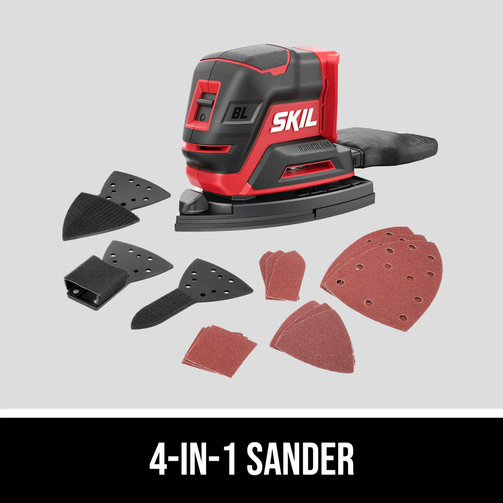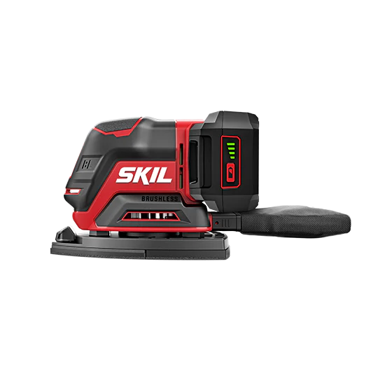Finish the job with the PWRCORE 20™ Brushless 20v Compact Multi-Sander from SKIL. This cordless hand sander is built with a compact design and low profile that allows for serious control. And, unlike many other sanders for woodworking, this mouse sander minimizes vibration and maximizes comfort thanks to its unique counterweight balance feature and soft rubber grip. Plus, the digital brushless motor delivers max efficiency, high-performance power, and extended tool life. This 4-in-1 cordless palm sander for woodworking includes 3 additional detail attachments for fine finishing large surfaces, corners/edges, hard-to-reach areas, and contoured surfaces. This orbit sander kit comes with a PWRCORE 20™ 2.0Ah Lithium Battery and Automatic PWRJUMP™ Charger, providing longer run time and battery life.