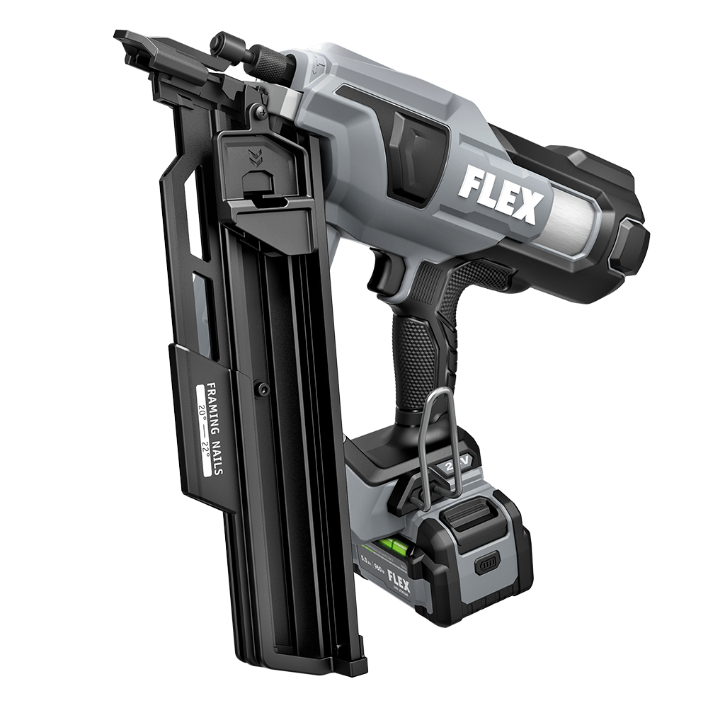 Power through framing jobs without the hassle of hoses and compressors with the FLEX 24V Brushless 21° Framing Nailer. This cordless framing nailer delivers high-speed power by driving up to 3 nails per second with zero ramp up time. It drives up to 1,100 nails on a single charge with a 5.0Ah lithium-ion battery for extended runtime. The nail gun features a depth adjustment dial to easily set the ideal depth when driving fasteners, and its dual LED worklight delivers better visibility in dark work areas. The cordless nail gun toggles between bump and sequential firing modes and has a nail indicator to easily see how many nails remain in the magazine. Dry-fire lockout avoids blank firing and damage to your work when the nail supply is exhausted. Its heavy-duty belt clip can be mounted on either side of the tool and features a lead-in profile. A convenient pivoting rafter hook allows additional easy storage when not in use. The framing nailer accepts 2-inch to 3-1/2-inch fasteners. This cordless nailer delivers the FLEX Advantage of unmatched battery power, runtime, and fast charging. Kit includes the 21° Framing Nailer, 5.0Ah lithium battery, 160W Fast Charger, rafter hook, belt clip, (3) no-mar tips, and a FLEX bag.