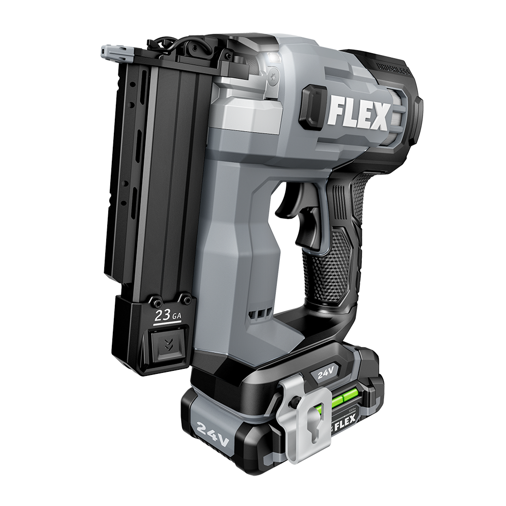 Power through baseboard installation, cabinet trim work, and other jobs without the hassle of hoses and compressors with the FLEX 24V Brushless 23Ga Pin Nailer. This cordless pin nailer delivers high-speed power by driving up to 3 nails per second with zero ramp up time. It drives up to 3,300 nails on a single charge with a 2.5Ah lithium-ion battery for extended runtime. The nail gun features a power adjustment dial to easily set the ideal depth when driving fasteners, and its dual LED worklight delivers better visibility in dark work areas. The cordless nail gun toggles between bump and sequential firing modes and has a nail indicator to easily see how many nails remain in the magazine. Dry-fire lockout avoids blank firing and damage to your work when the nail supply is exhausted. Tool-free jam clearance allows you to quickly clear jammed nails without tools for maximum efficiency when you’re on the job. The cordless nailer is compact and lightweight to conquer tight spaces with minimal fatigue. Its belt clip can be mounted on either side of the tool and features a lead-in profile. The finish pin nailer accepts 5/8-inch to 1-1/2-inch 23-gauge fasteners. This cordless nailer delivers the FLEX Advantage of unmatched battery power, runtime, and fast charging. Kit includes the 23Ga Angled Finish Pin Nailer, 2.5Ah lithium battery, 160W Fast Charger, belt clip, (3) no-mar tips, and a FLEX bag.