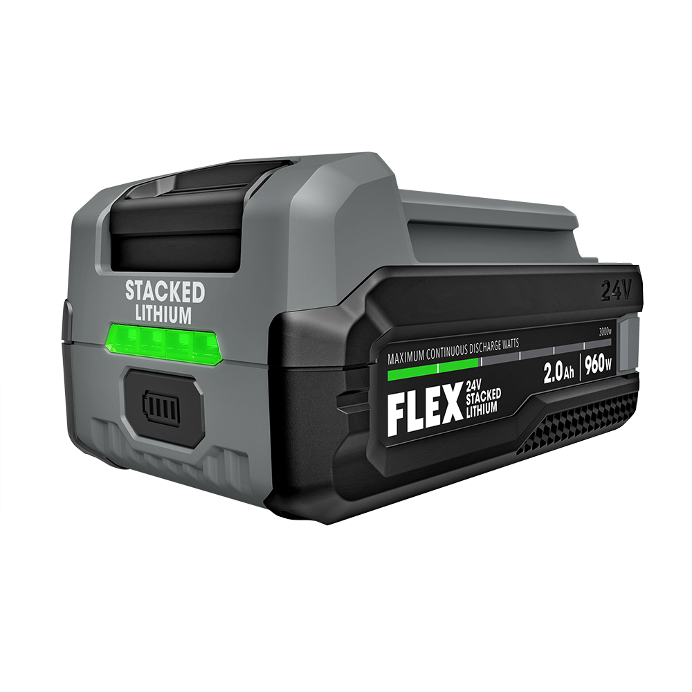 The FLEX 24V Stacked Lithium Battery Platform offers industry-dominating power and performance. Its intelligent power management enables higher discharging, and it combines THERMA-TECHâ„¢+ cooling technology with high-performance heat management protection to offer faster charging and a longer battery life to power through the workday. The 2.0Ah Stacked Lithium battery fully charges in little as 18 minutes with a 550W Super Charger (FX0431, sold separately).