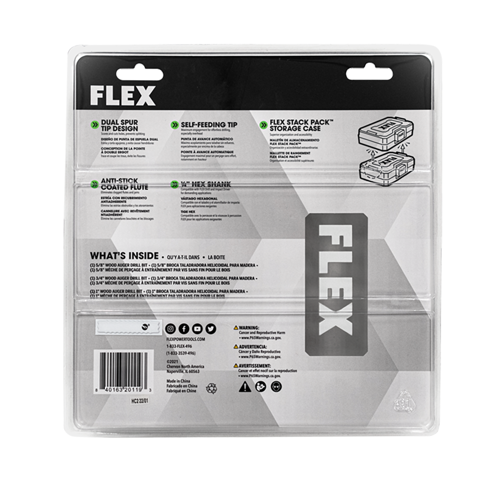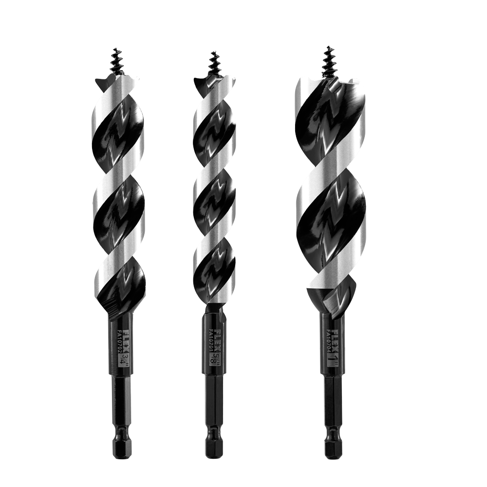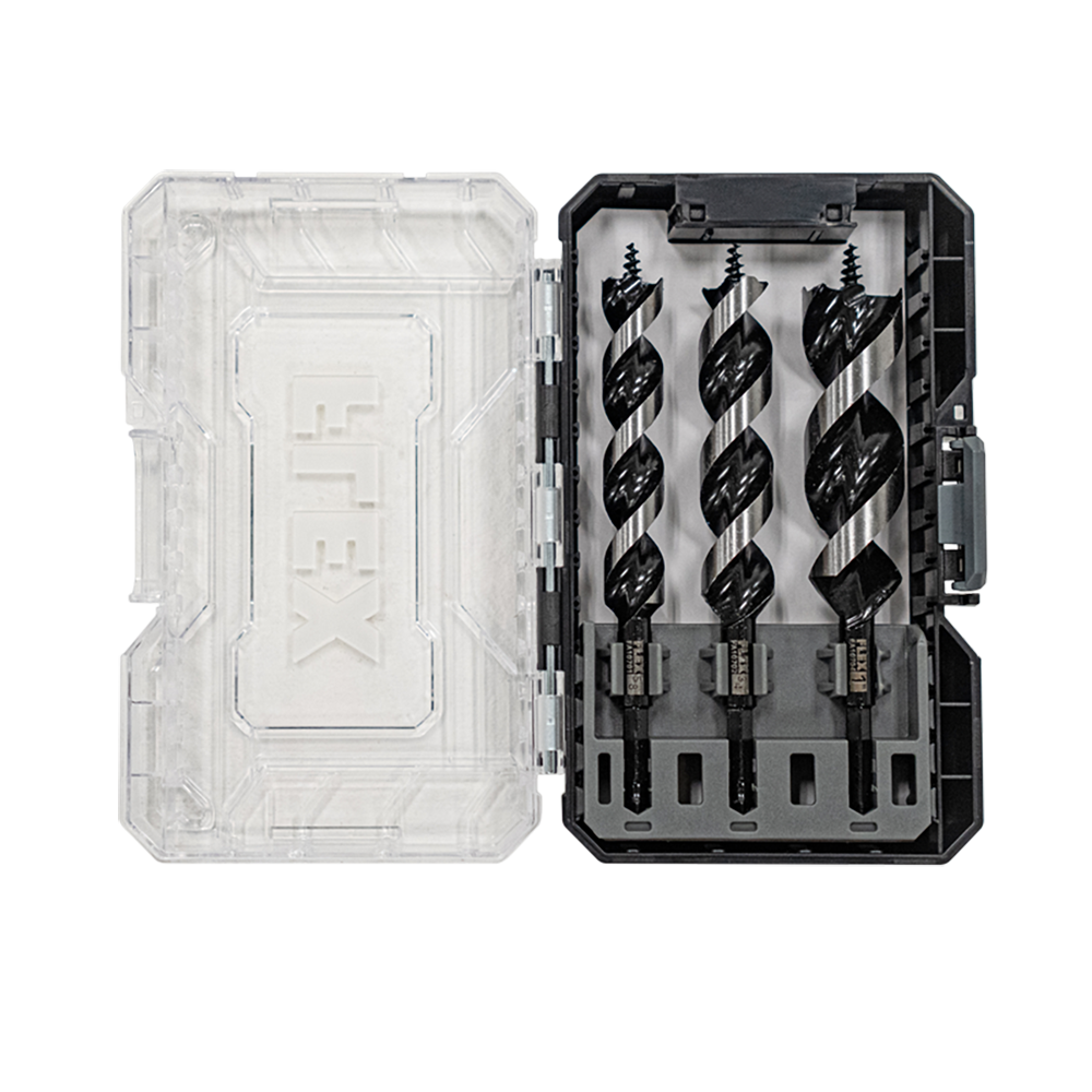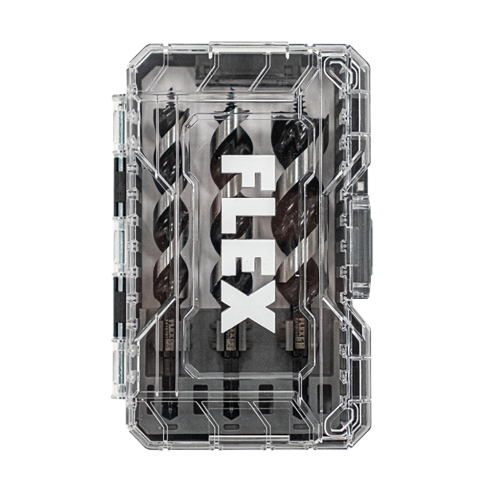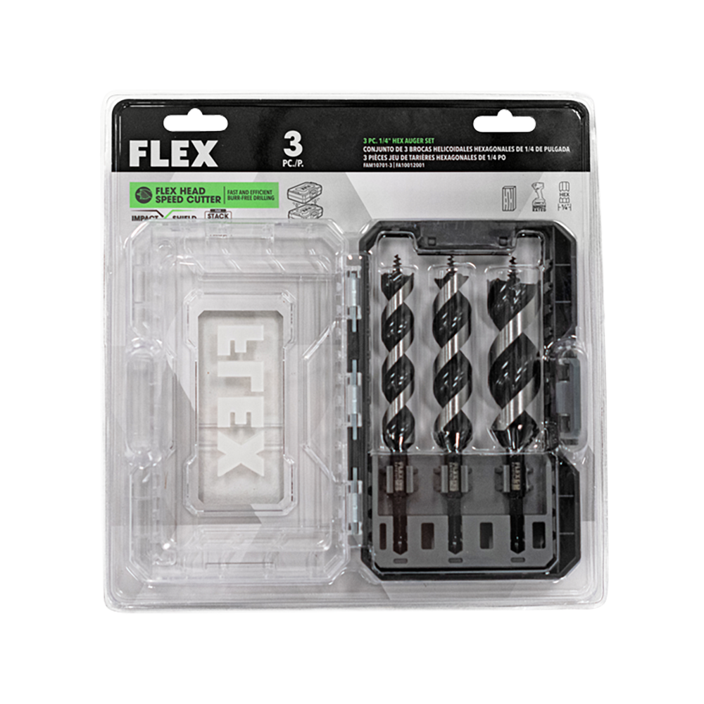 When the job requires you to power through hole after hole with speed and efficiency, the FLEX 3-Piece 1/4” Hex Auger Set dominates. The FLEX Head Speed Cutter delivers fast and efficient burr-free drilling, and Dual Spur Tip Design scores and cuts holes while preventing splitting. The Self-Feeding Tip maximizes engagement for effortless drilling, especially when working overhead. Clogged flutes and jams are an afterthought thanks to the auger’s Anti-Stick Coated Flute. The ¼-inch Hex Shank is compatible with FLEX Drills and Impact Drivers for demanding applications. All this comes packed in a FLEX STACK PACK™ storage case for customizable organization and easy accessibility in any case in the STACK PACK™ lineup.