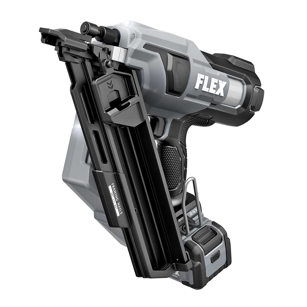 Power through framing jobs without the hassle of hoses and compressors with the FLEX 24V Brushless 30° Framing Nailer. This cordless framing nailer delivers high-speed power by driving up to 3 nails per second with zero ramp up time. It drives up to 1,100 nails on a single charge with a 5.0Ah lithium-ion battery for extended runtime. The nail gun features a depth adjustment dial to easily set the ideal depth when driving fasteners, and its dual LED worklight delivers better visibility in dark work areas. The cordless nail gun toggles between bump and sequential firing modes and has a nail indicator to easily see how many nails remain in the magazine. Dry-fire lockout avoids blank firing and damage to your work when the nail supply is exhausted. Its heavy-duty belt clip can be mounted on either side of the tool and features a lead-in profile. A convenient pivoting rafter hook allows additional easy storage when not in use. The framing nailer accepts 2-inch to 3-1/2-inch fasteners. This cordless nailer delivers the FLEX Advantage of unmatched battery power, runtime, and fast charging. Kit includes the 30° Framing Nailer, 5.0Ah lithium battery, 160W Fast Charger, rafter hook, belt clip, (3) no-mar tips, and a FLEX bag.