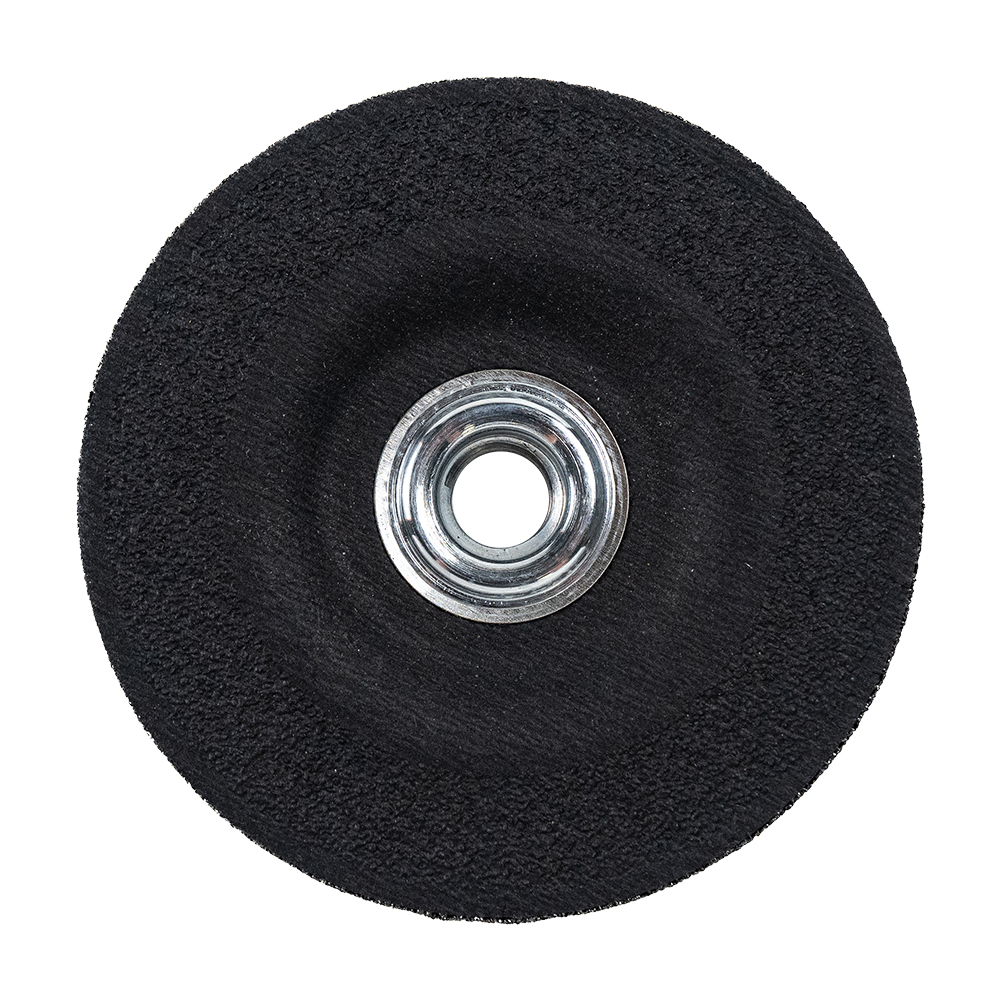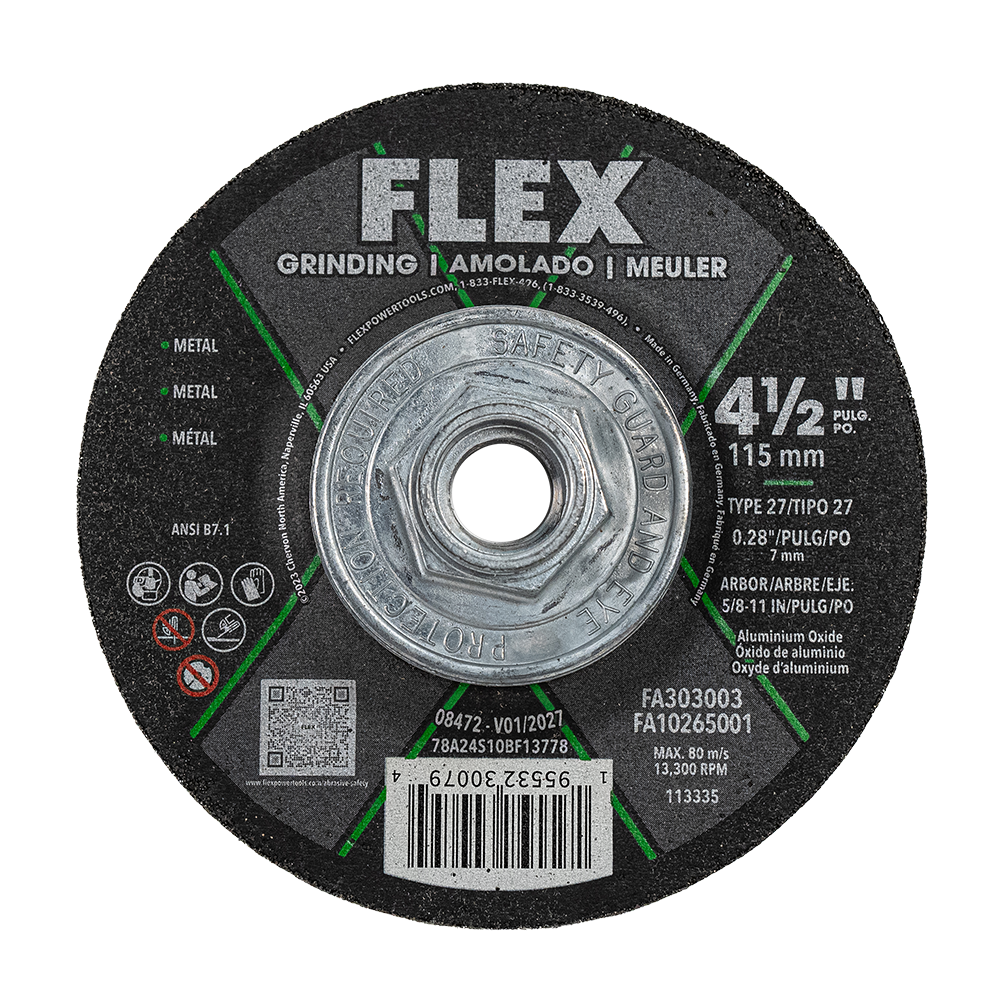 Grind and shave metal and make quick and easy disc changes with the FLEX 4-1/2” Hub Grinding Disc. This 4.5-inch grinding disc features a hub arbor design that allows the disc to be screwed on, eliminating the need for a locking nut. The disc’s aluminum oxide grain delivers quick material removal without generating excessive heat for use with steel, stainless steel, non-ferrous metals, and cast iron. Its depressed center allows ample clearance when working at a constrained angle for shallow angle grinds. Its iron- and sulfur-free construction reduces oxidizable particles left behind on finished surfaces to help prevent rust, while a coating slows moisture exposure for extended disc life. Three full-face fabric layers hold this disc together for added stability and safety during use.