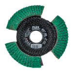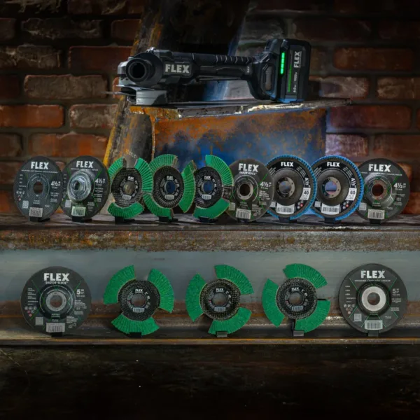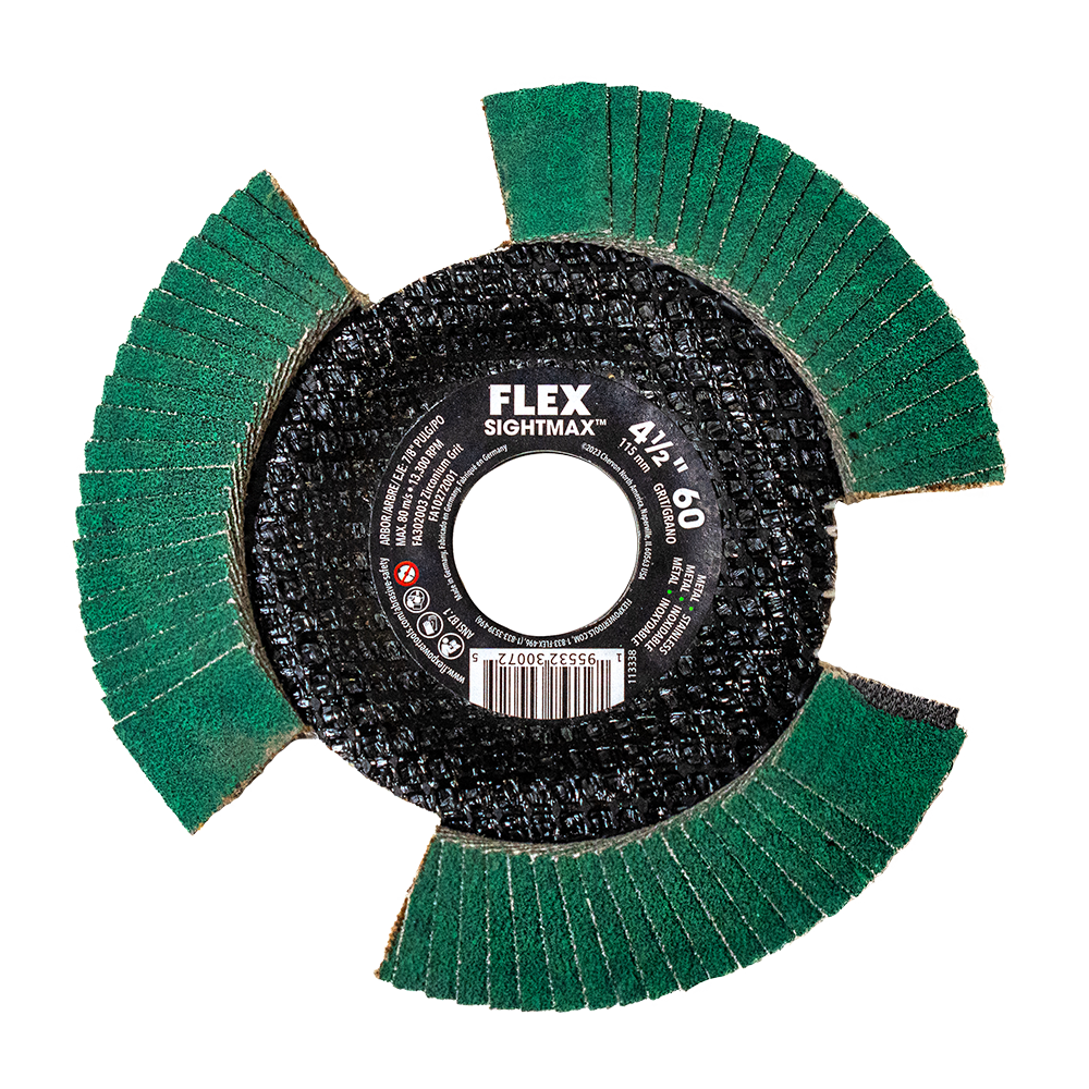 Clearly see the surface you are prepping, smoothing, or blending with the FLEX 4-1/2” SIGHTMAX™ 60 Grit Flap Disc. This 60-grit flap disc improves the working experience with its innovative segmented design that delivers transparent line of sight to the work surface while grinding or surfacing for reduced over-abrasion and maximum efficiency. Along with its segmented design, a special coating reduces heat buildup on the disc compared to traditional flap discs for increased performance and longer life. SIGHTMAX™ flap discs utilize a high-quality zirconium abrasive grain for quick stock removal, and their iron- and sulfur-free construction reduces oxidizable particles left behind on finished surfaces to help prevent rust from forming. A coating slows moisture exposure for extended disc life. The conical 10-degree flap arrangement improves grinding ergonomics for improved tool handling.