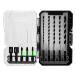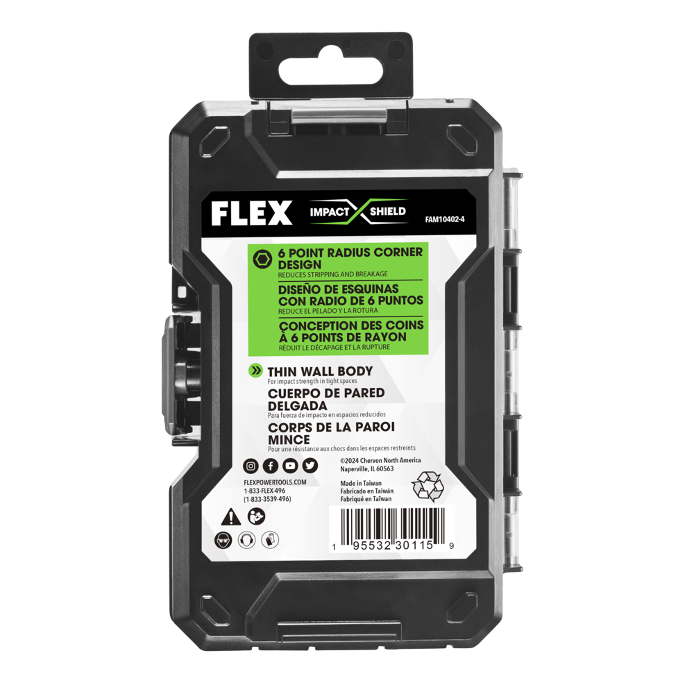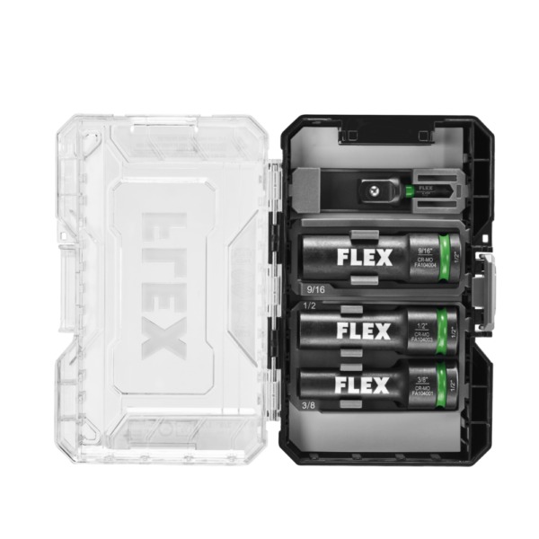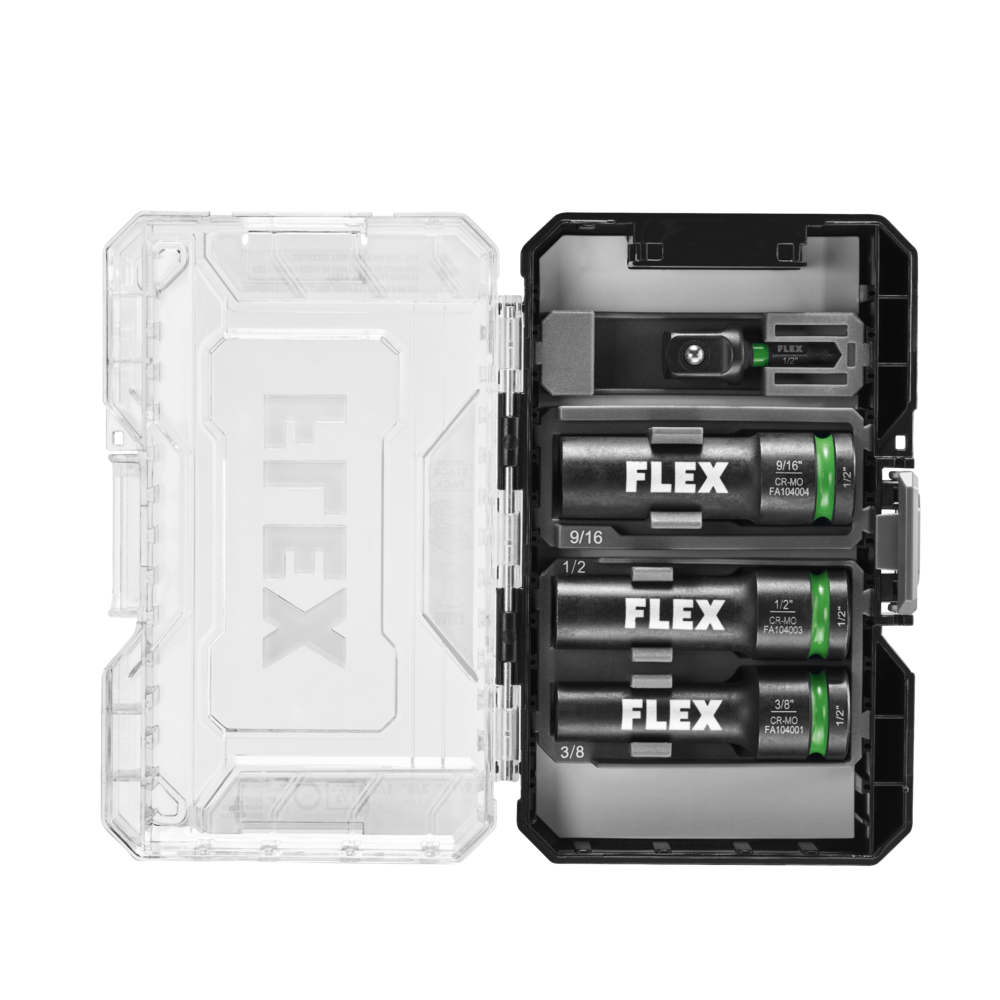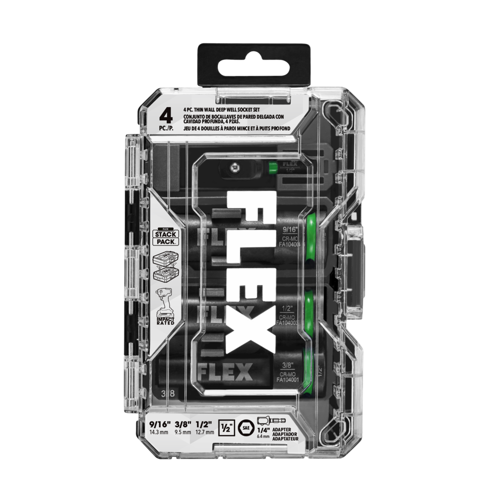 The FLEX 4-Piece Thin Wall Deep Well Socket Set equips you with maximum strength and durability for high-torque impact driving. The six-point radius corner design reduces stripping and breakage while the deep well 3-inch thin wall body helps you dominate tight spaces. Make changes on the fly with the intuitive green powder coated groove ring indicating the drive head from anvil interface. Dual ball holes allow you to attach the socket with more variance. The four-piece socket set comes packed in a FLEX STACK PACK™ Bit Case for customizable organization and compatibility with select storage cases in the STACK PACK™ lineup. The socket set includes 9/16-inch, 3/8-inch, 1/2-inch sockets with a ½-inch to ¼-inch adapter.