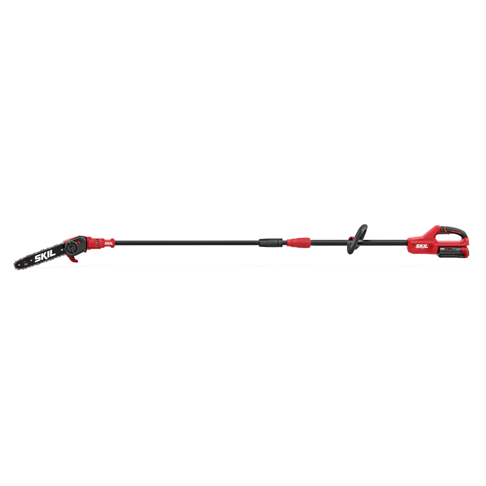 Add cutting reach and durability to your tool shed with the SKIL 40V Brushless 10 In. Pole Saw. The cordless electric pole saw features a digital brushless motor that delivers efficient, high-performance power without the hassle of gas. Its lightweight telescopic aluminum shaft extends from 7.5 to 9.5 feet for extended reach, making it an ideal choice among pole saws for tree trimming. Its angled 10-inch bar and auto-lubricating chain delivers versatile, controlled cutting with a 7.5-inch cut capacity while its adjustable auxiliary handle lets you dial in your preferred grip for even more control when cutting overhead. Tighten the chain on the tree trimmer with the twist of a dial for hassle-free adjustments between cuts. The battery pole saw kit includes the 40V pole saw, 2.0Ah battery, and 60W charger.