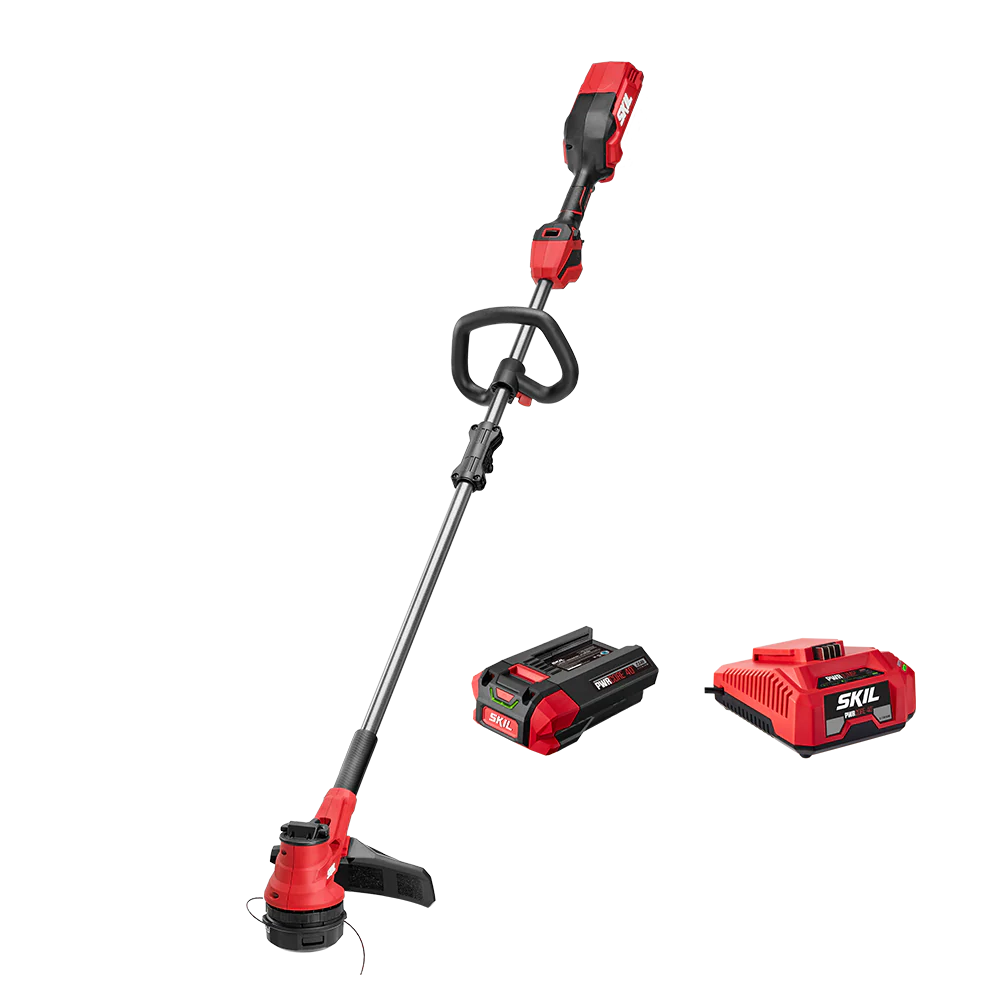 The SKIL 40V 15 In. String Trimmer with Smart Load™ is made for performance, efficiency, and ease of use, saving time as you handle everything from trimming and light edging to tackling the toughest grass and weeds. Its digital brushless motor delivers the power to cut through thick grasses and weeds with ease. The 15-inch cutting swath on this weed eater ensures you can trim quickly and efficiently, and its two-speed selector allows you to choose between maximizing power or runtime. Simply tap the dual-line bump feed head on the ground to release more line and continue working. When the 0.095-inch weed trimmer line needs to be replaced, the innovative Smart Load™ head allows fast, easy line loading: just feed the line and open the crank, wind the crank counterclockwise, then close the crank and get back to work in seconds. Level up your lawn care game—without the hassle of gas—with a grass trimmer built for performance, efficiency, and ease of use. The string trimmer kit includes a 40V 2.0Ah battery and 60W charger.