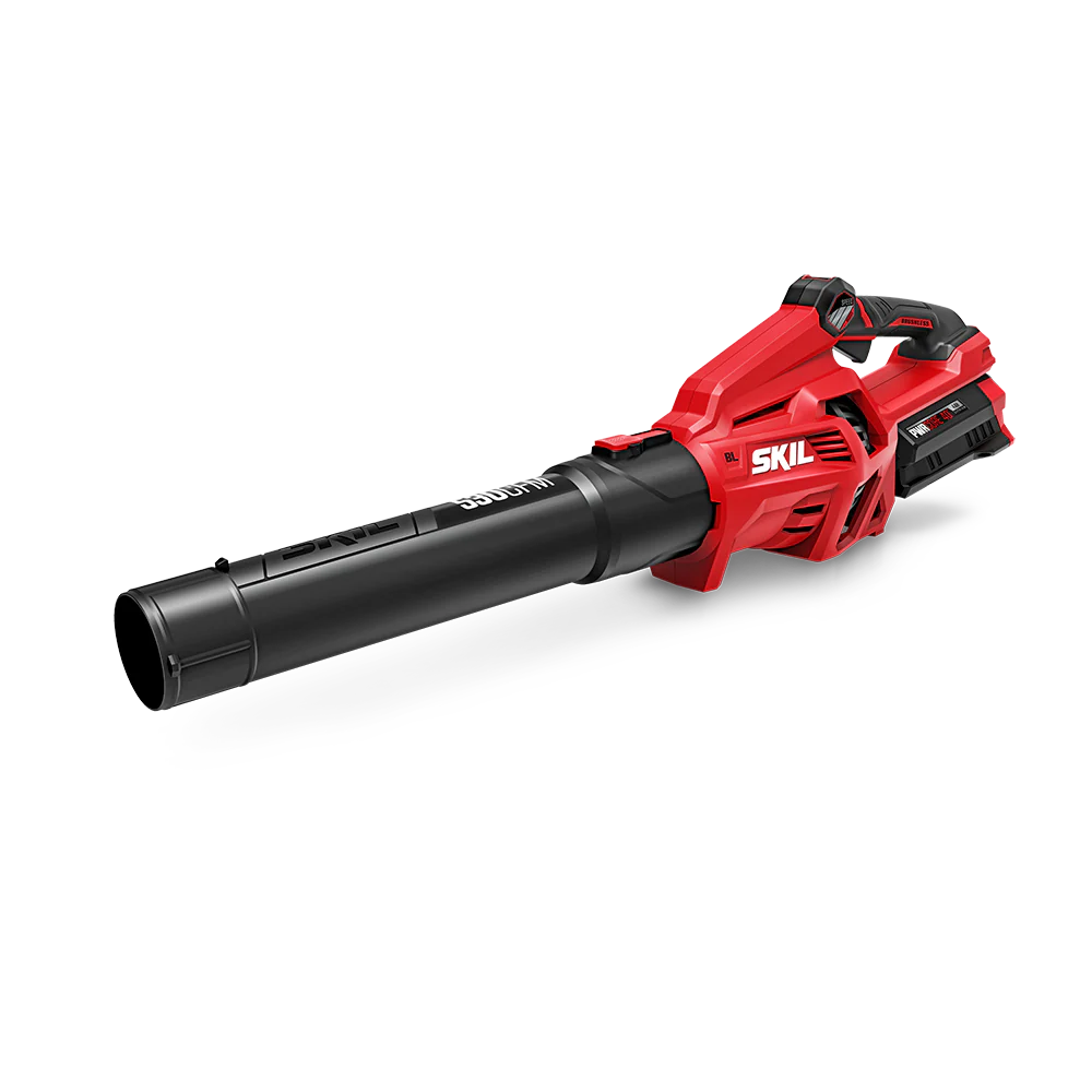 The SKIL 40V 530 CFM Leaf Blower features a digital brushless motor that delivers efficient, high-performance power without the hassle of gas. The cordless leaf blower features a turbine fan that maximizes performance with up to 530 CFM of clearing power and air speeds up to 140 MPH. A variable speed trigger allows you to control everything from clearing delicate flower beds to blowing leaves and grass clippings from your driveway, sidewalks, or whole back yard. Activate power boost to blast through heavy, wet leaves and light debris. From fall cleanup to getting the deck or patio summer-ready, the blower helps save you time on yard work and chores. IPX4-rated water resistance provides added durability for use in tough weather conditions, and a quick-release tube ensures compact storage between uses. This battery leaf blower kit includes a 4.0Ah PWRCORE 40™ battery and 60W charger.