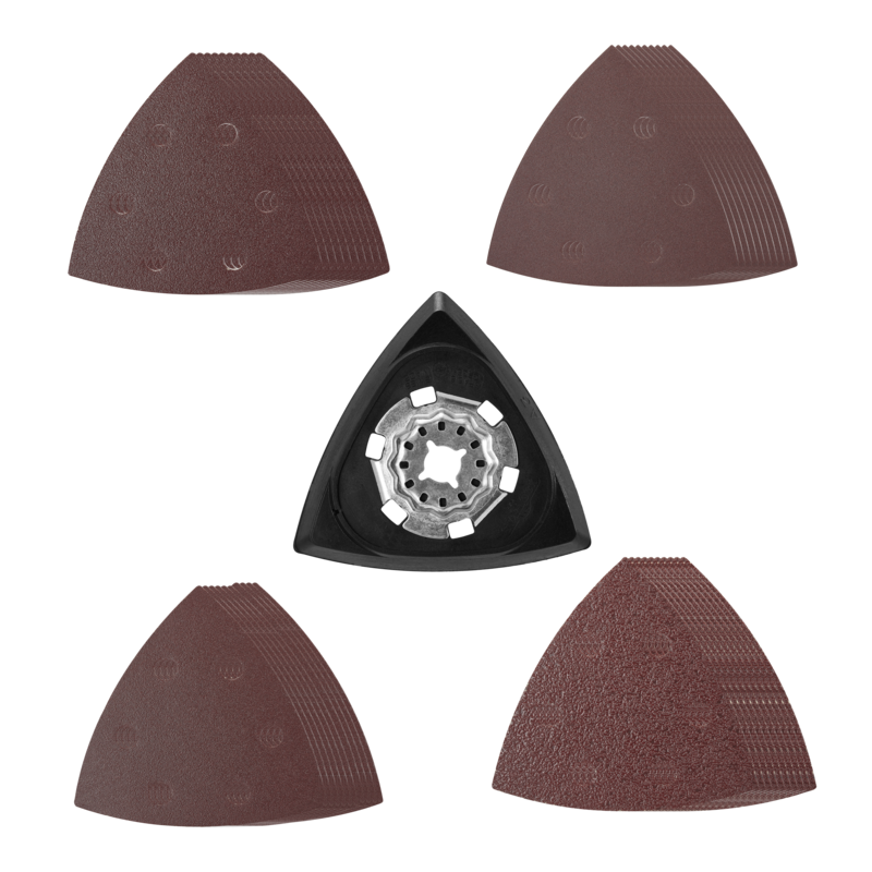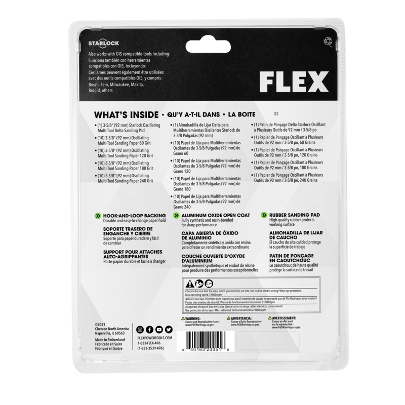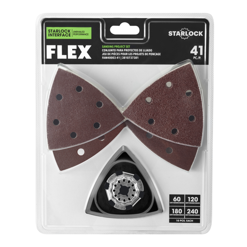 Go for adaptable grit with the FLEX Sanding Project set, complete with a FLEX Oscillating Multi-Tool sanding pad and multiple, fitted sanding paper grit grades. Enhance your sanding performance with the dependability of a Starlock Interface—putting maximum power behind your every grain. This set also provides the adaptable advantage of hook and loop fastening for swappable and secure pad and paper.