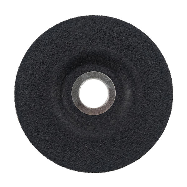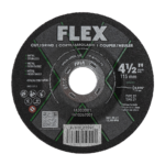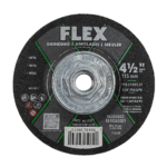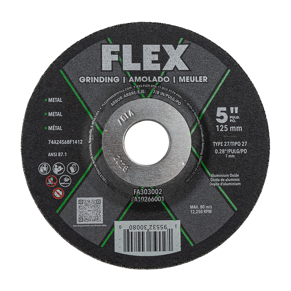 Grind and shave metal with the FLEX 5” Grinding Disc. This 5-inch grinding disc features an aluminum oxide grain for quick material removal without generating excessive heat for use with steel, stainless steel, non-ferrous metals, and cast iron. Its depressed center allows ample clearance when working at a constrained angle for shallow angle grinds. Its iron- and sulfur-free construction reduces oxidizable particles left behind on finished surfaces to help prevent rust, while a coating slows moisture exposure for extended disc life. Three full-face fabric layers hold this disc together for added stability and safety during use.