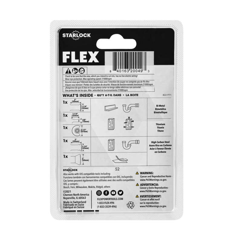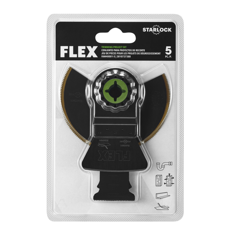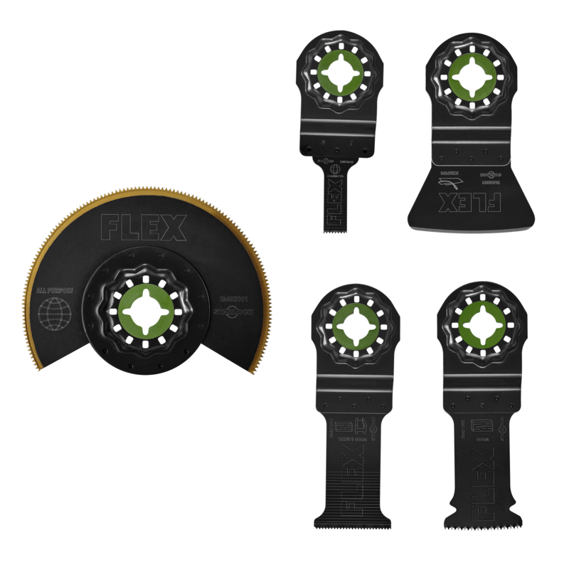 The FLEX Trimming Project Set delivers a versatile selection of FLEX Oscillating Multi-Tool blades to meet all your trimming demands. Put your full power behind every cut with the performance-optimizing Starlock Interface—ensuring maximum energy transfer from tool to blade. Plunge, scrape, and more with precision and control provided by superior, arched blade designs and durable bi-metal, titanium, and high carbon steel constructions.