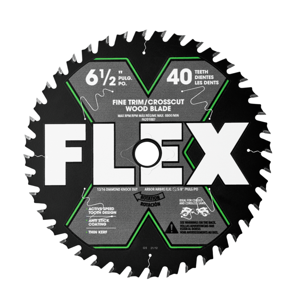 FLEX 6-1/2” 40T Fine Trim/Crosscut Wood Blades cut with unrelenting speed and durability. This high-density blade is made with Active Speed Carbide for sharpness that lasts, and its 40-tooth design is optimized for smooth and clean finishing cuts. This blade’s laser-cut form and ultra-thin kerf ensure precision and accuracy in every finishing cut. Friction, heat, gumming, and corrosion don’t stand a chance against this blade’s anti-stick coating. Package includes 10 blades.