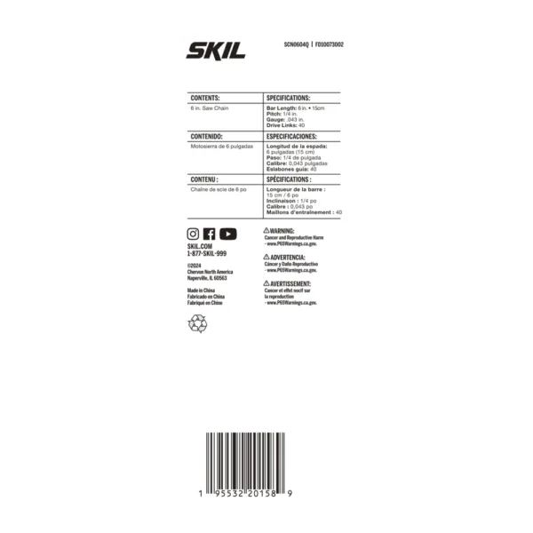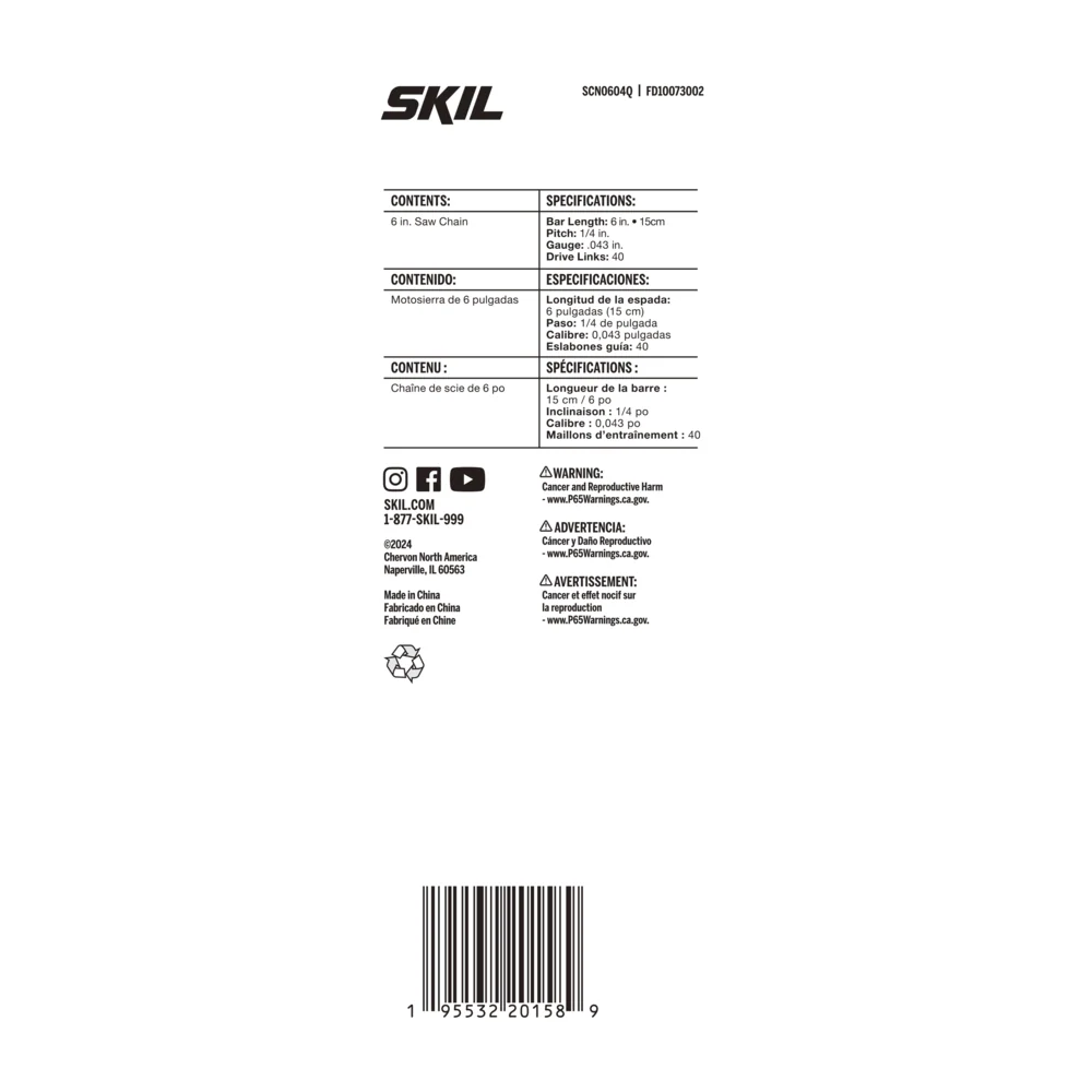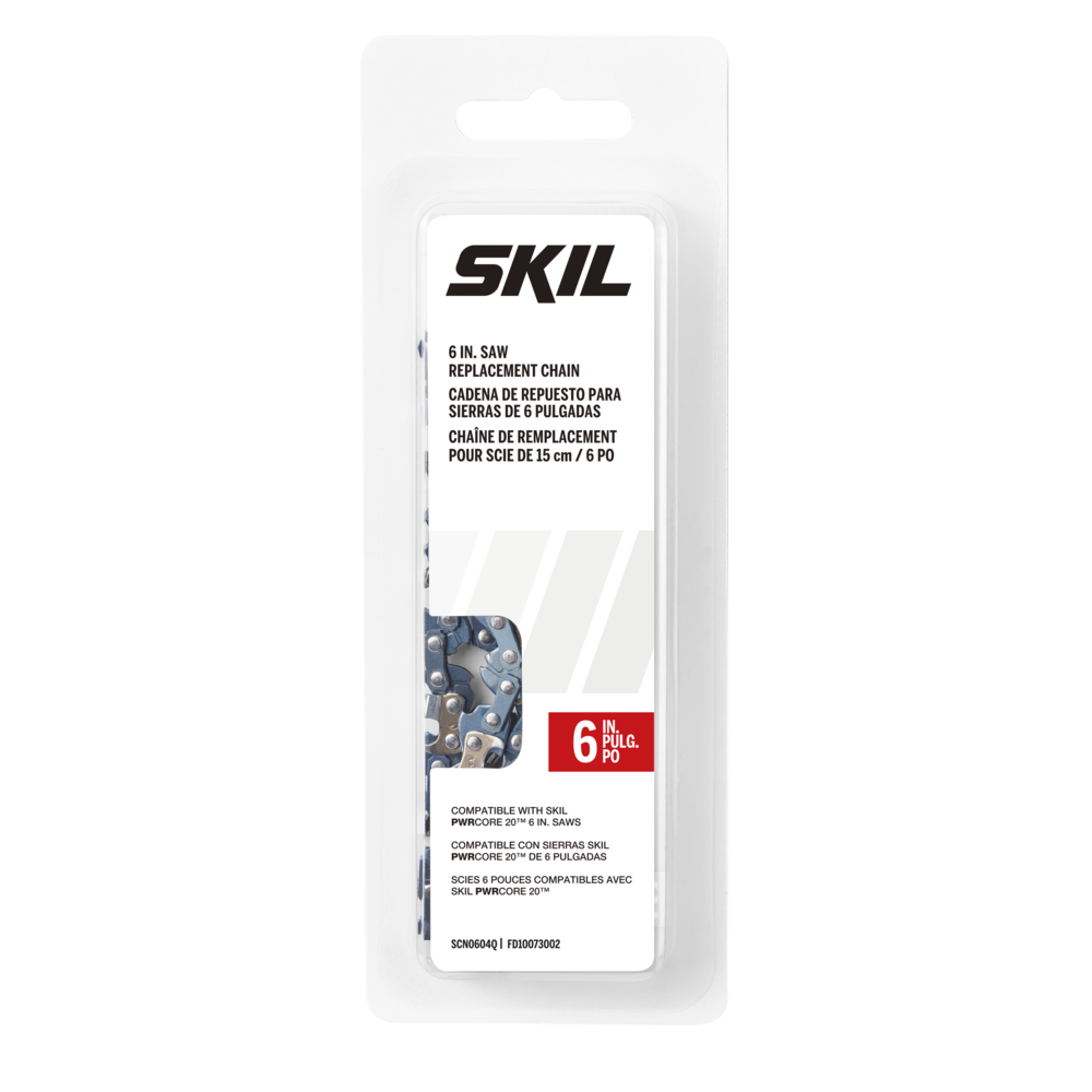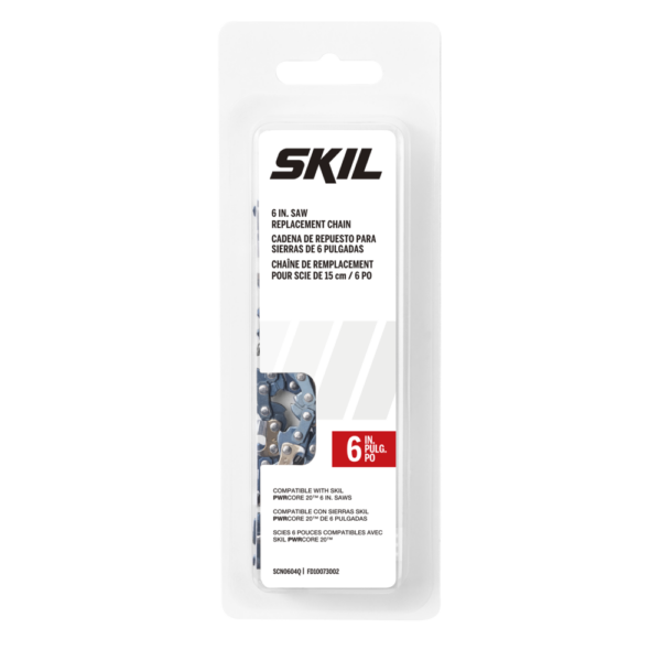 Keep your SKIL 6-inch saw performing at its best with the SKIL 6 In. Saw Replacement Chain. This replacement chain is compatible with all SKILÂ PWRCORE 20â„¢ 6-inch saws like the 6 In. Pruning Saw (PR0600B) and 6 In. Telescopic Pruning Saw (PR0601B). The chain features a 3/8-inch low profile pitch, .043-inch gauge, and 33 drive links. It has a low kickback design to help reduce kickback without impacting the power and performance of your cordless saw.
