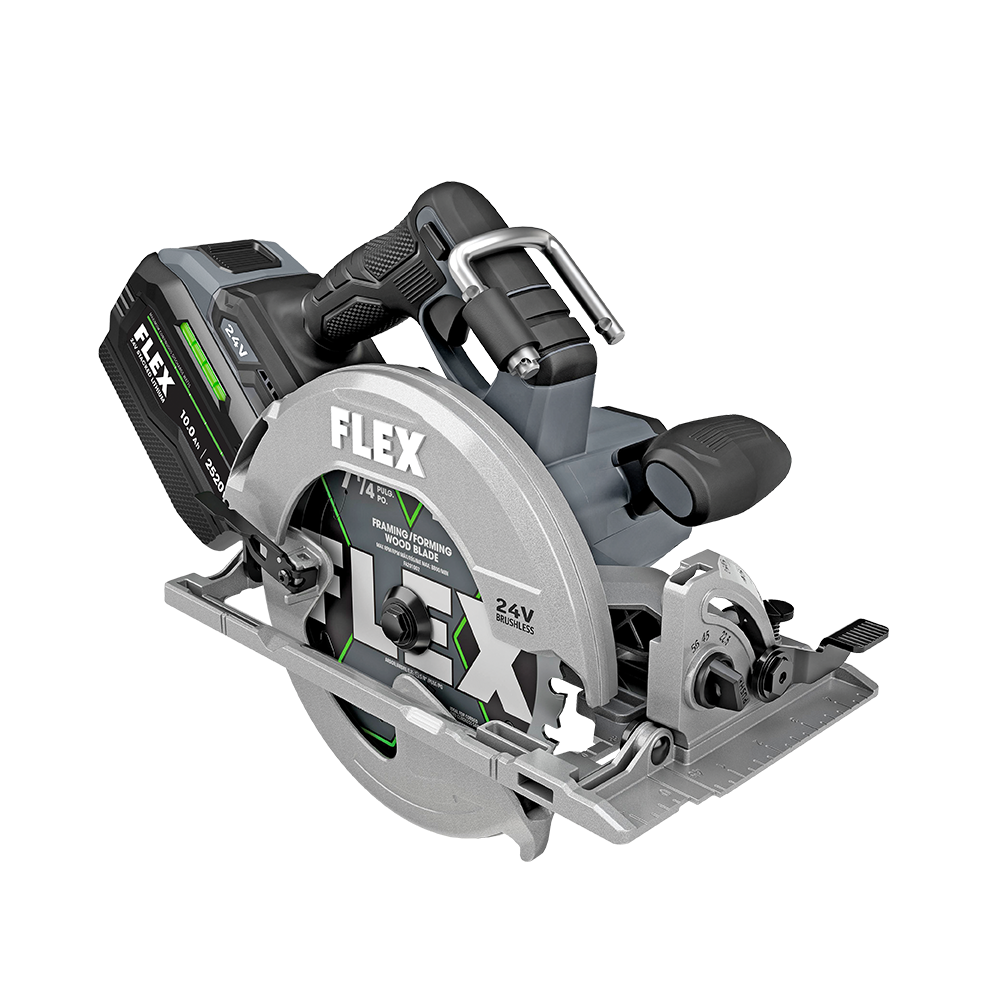 Rip through miles of 2x4s with the FLEX 24V Brushless 7-1/4″ Circular Saw. This lightweight and durable beast is built for advanced cutting performance and ultimate cutting capacity (up to 2-5/8″). Built-in LED light illuminates workpiece, providing superior precision and accurate cuts. This saw’s powerful motor is maximized by the FLEX Stacked Lithium Advantage: unmatched 24V battery power, runtime, and fast charging speed. Includes saw, one 24V battery, and charger.