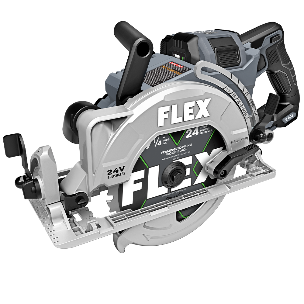 Rip through miles of 2x4s with the FLEX 24V Brushless 7-1/4″ Rear Handle Circular Saw. Both lightweight and durable, this precision cutting tool is a control freak, positioning the blade to the left of the motor and placing the handle at the rear to optimize line of sight. Built for advanced cutting performance and ultimate cutting capacity (up to 2-5/8″). Built-in LED light illuminates workpiece providing superior precision and accurate cuts. This saw’s powerful motor is maximized by the FLEX Stacked Lithium Advantage: unmatched 24V battery power, runtime, and fast charging speed. Includes saw, one 24V battery and charger.