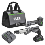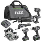 This cutting focused four-tool kit brings together the powerful FLEX 7-1/4″ Circular Saw Bare Tool, 1/2″ 2-Speed Drill Driver, 1-1/4″ Reciprocating Saw, and the Fixed Speed Angle Grinder with Side Switch. Each shares the FLEX Advantage of an unrivaled 24V battery power and runtime. This kit includes all four tools, two 24V batteries, one charger, and additional attachments: Blade wrench, Vacuum adaptor, Lower guard lever, Bit holder, Belt clip, Grinding guard, Wrench, Auxiliary handle. Accessories include: 7-1/4″ 24T CT 5/8″ arbor, 9” 6TPI wood with nails demolition blade, and 6” 8/11TPI thick metal demolition blade.