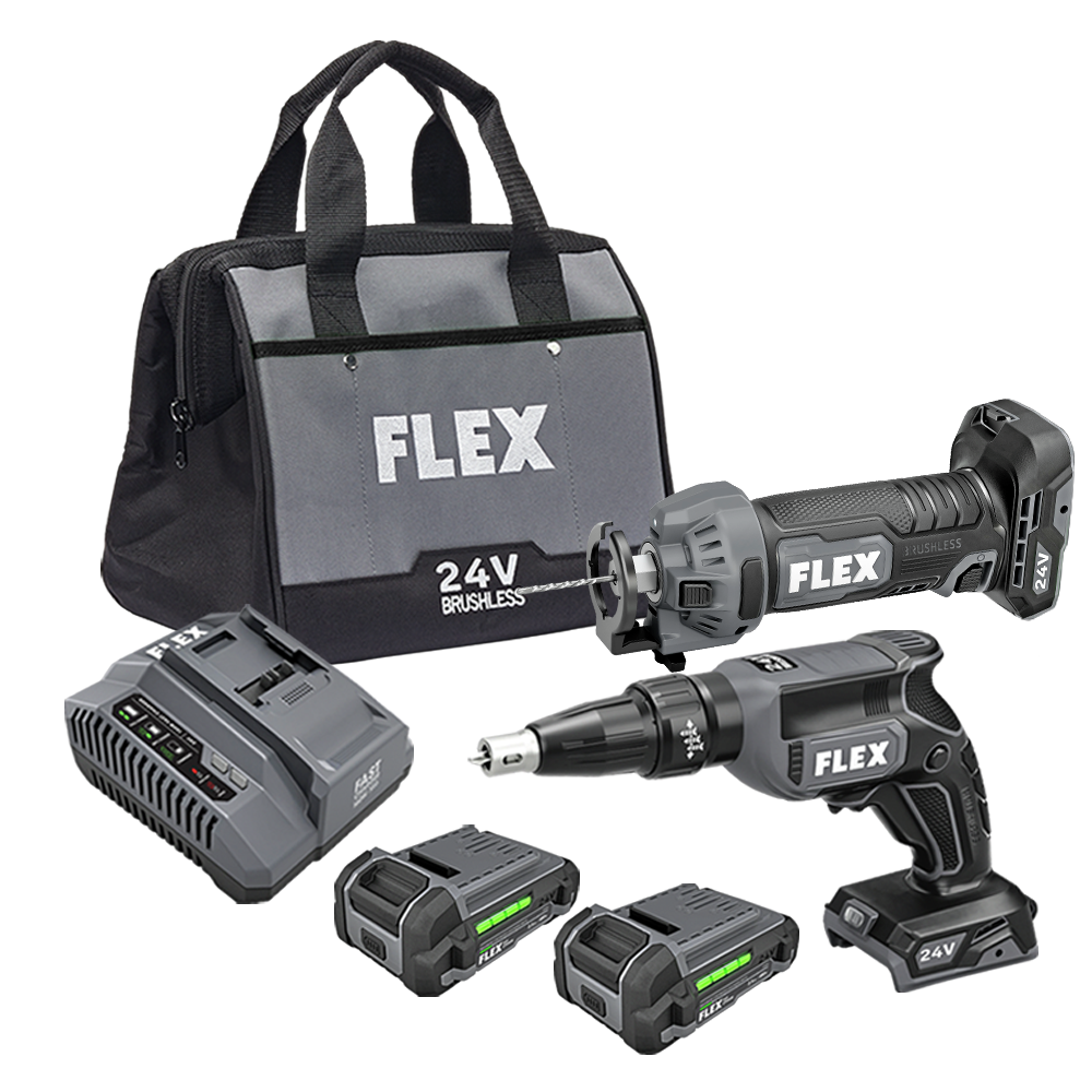 Conquer drywall projects from start to finish with the versatility and power of the FLEX 24V Drywall Screw Gun and Drywall Cut Out Tool Combo Kit. Hang sheet after sheet with ease with the FLEX 24V Drywall Screw Gun. This lightweight screw gun arms you with ultimate in speed and efficiency with maximum control. Lock-on mode delivers continuous power to secure drywall panels. Setup is easy with tool-free adjustments. The bright, built-in LED light illuminates dark spaces. This cordless drywall screw gun is compatible with the FLEX Magazine Attachment (FT161, sold separately) for increased productivity with collated screws. The FLEX 24V Drywall Cut Out Tool powers through the entire day with exceptional runtime—up to 150 outlet boxes per charge with the included 2.5Ah battery. Adjustable airflow directs the dust away from the work in the direction desired. Built-in LED lighting illuminates in dark conditions. All this performance is built on the FLEX Advantage of unmatched battery power, runtime, and fast charging. The combo kit includes both tools, (2) 2.5Ah batteries, and a 160W Fast Charger. It’s