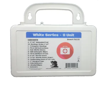 The FA115 is a general purpose first aid kit with a very nice set of contents in a white plastic case. This kit could be used as a small home kit or is also perfect for the trunk of your car; equipped with a variety of essentials that could be used in an emergency.