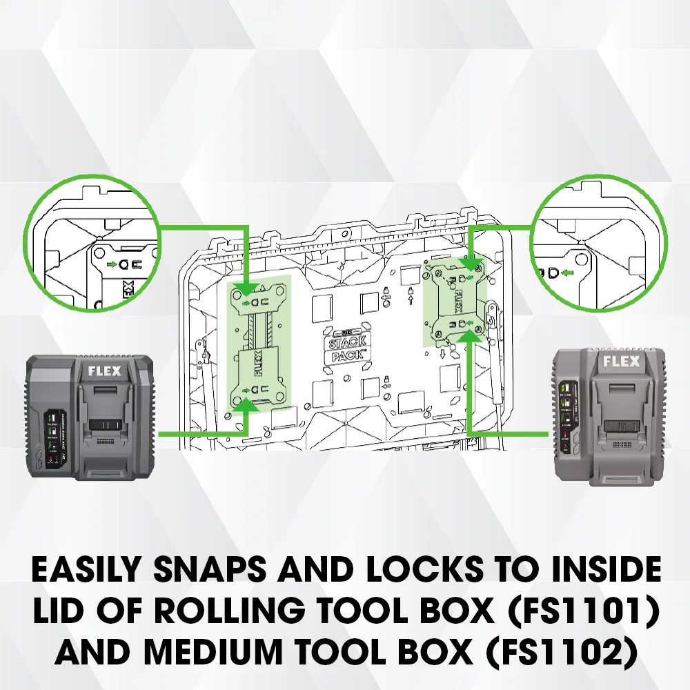 From inside the lid of your STACK PACK⢠storage case to the walls of your workshop, the FLEX STACK PACK⢠Adjustable Charger Mounts 2-Pack includes flexible mounting plates to securely store your FLEX 24V chargers for easy accessibility on the job or in the shop.