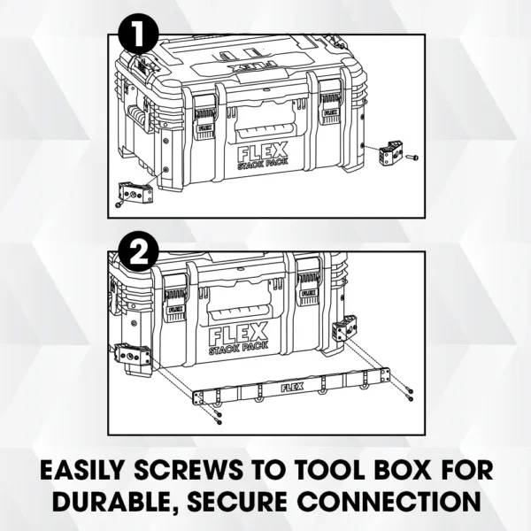 When you need easy access to multiple tools to get the job done, the FLEX STACK PACK⢠Front Tool Rack Rail offers a place to make a quick tool change so you can power through the day. The rail is made from steel with a slip-resistant design to securely hang your tools, and it easily attaches to the corner protectors of your FLEX STACK PACK⢠storage case for heavy loading capacity.