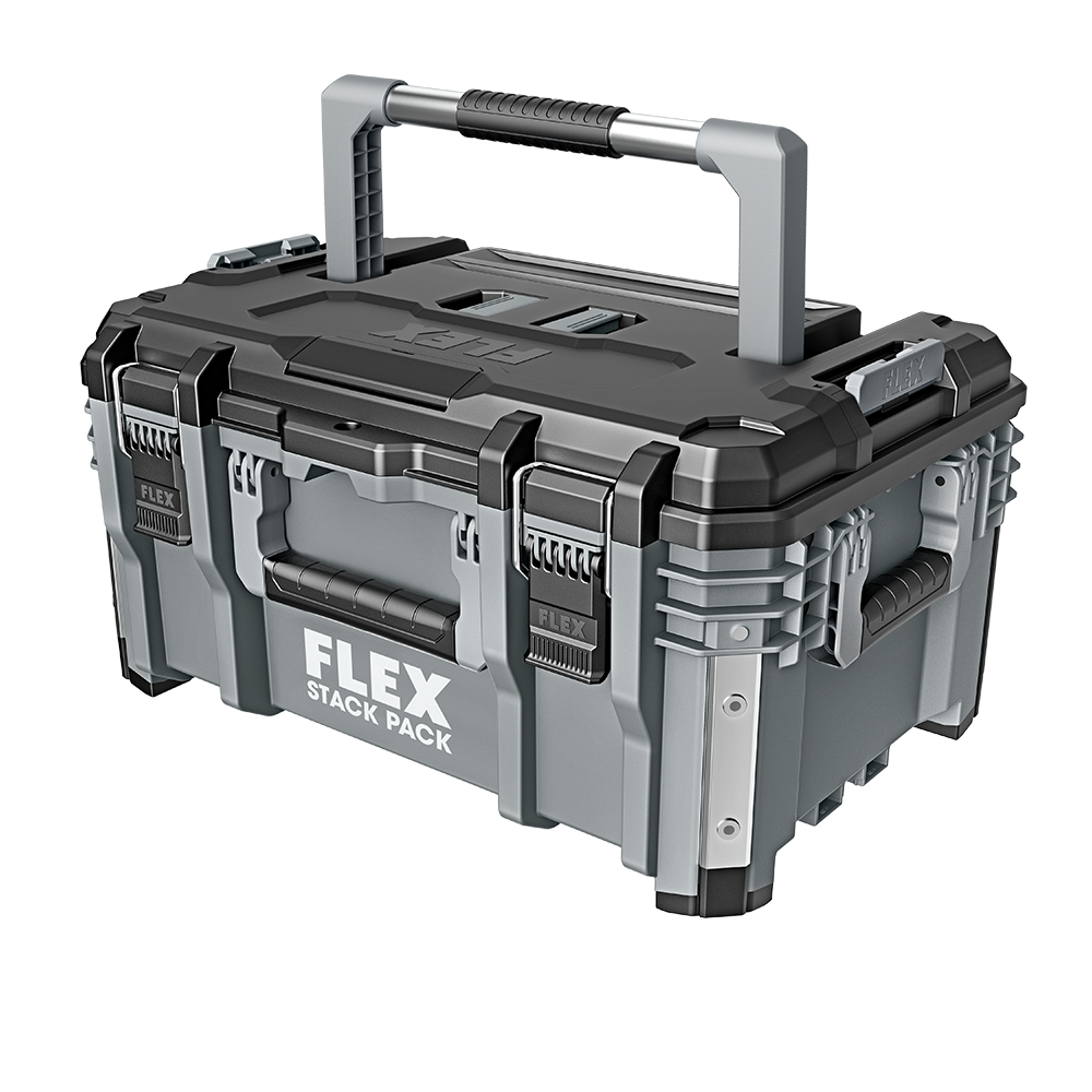 Pack everything you need for a day on the job with the FLEX STACK PACK⢠Medium Tool Box. A metal-reinforced top cantilever handle allows you to confidently carry your tools to and from the jobsite, and two-piece durable locks ensure the lid stays closed securely. Load, offload, and maneuver the box easily from any angle with front and side grab handles. IP65 all-weather protection shields your tools and accessories from the elements, and an impact-resistant polypropylene body with aluminum reinforced corners offers protection from the toughest jobsite conditions. Quick-connect interlocking attachment points offer fast and effortless connectivity with any piece in the STACK PACK⢠storage system so you can custom build your layout for the ultimate traveling workshop. Protected by a one-year limited warranty when registered within 30 days of purchase at registermyFLEX.com.