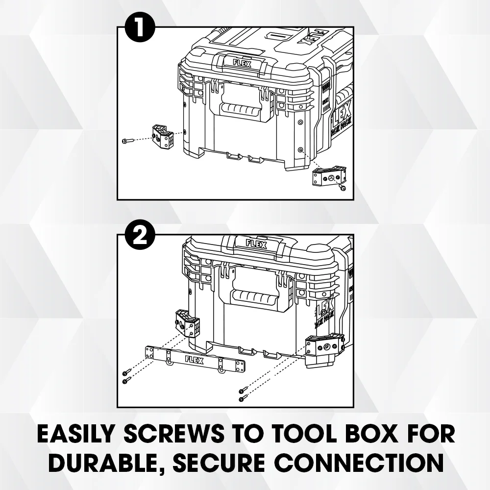 When you need easy access to multiple tools to get the job done, the FLEX STACK PACK⢠Side Tool Rack Rails 2-Pack offers places to make a quick tool change so you can power through the day. These rails are made from steel with a slip-resistant design to securely hang your tools, and they easily attach to the corner protectors of your FLEX STACK PACK⢠storage case for heavy loading capacity.
