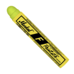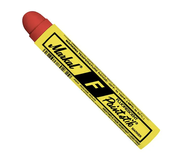 Markal F Fluorescent RED Cold Surface Marker with a point size of 11/16″ is suitable for immediate identification in low light conditions and creates highly visible marks. Marker of length 4 3/4″ provides fluorescent marks that illuminate under UV or black light. It has a marking range of -50 to 150 deg F and the easy to hold paperboard holder secures the marker for optimum use. It is ideal for surfaces like steel and iron, pipes and tubes, rubber and tires, glass, plastic, lumber and timber.