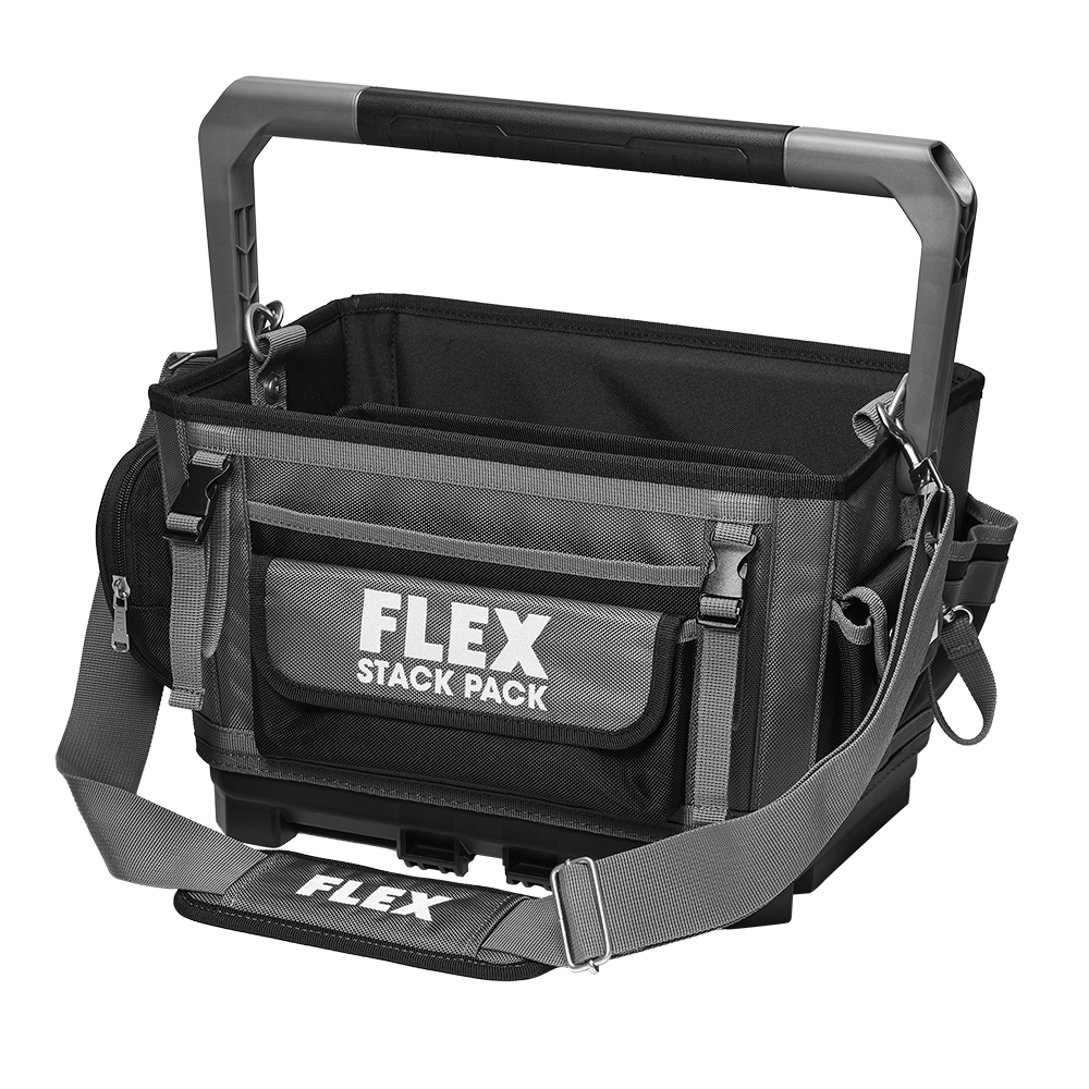 Pack and organize the tools youāll need for a day on the job with the FLEX STACK PACK⢠16ā Tote. The tote features 44 pockets and slots plus a large removable divider for a fully customizable layout, and its overmold handle pivots so you can quickly access your tools and accessories while you work. The tote is made from ultra-durable 1680D high-density ballistic polyester to stand up to everyday wear and tear. A padded shoulder strap is included for carrying the tote to, from, and around the jobsite, and a back pad provides additional support. Quick-connect interlocking attachment points offer fast and effortless connectivity with other toolboxes in the STACK PACK⢠storage system for a fully customized layout. Itās protected by a one-year limited warranty when registered within 30 days of purchase at registermyflex.com.