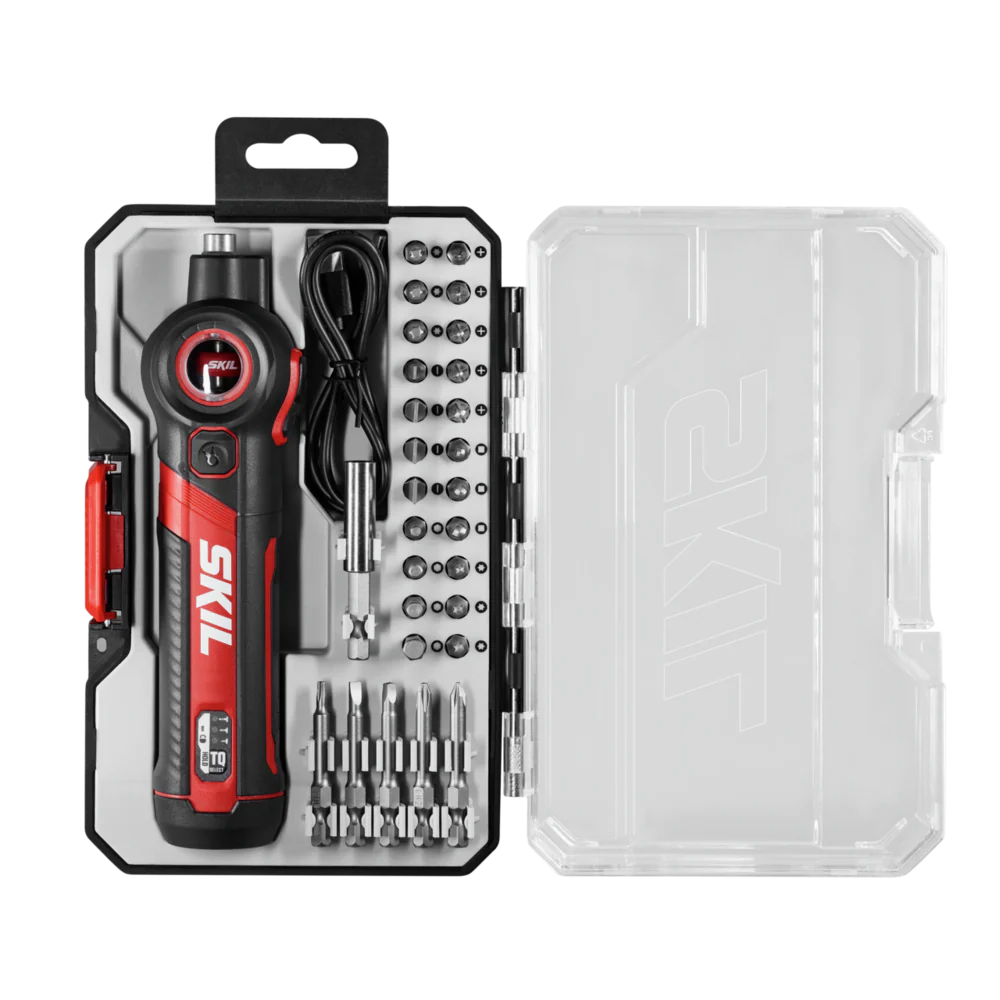 From assembling furniture and toys to tightening screws in hard-to-reach cabinets, get small jobs and repairs done quickly and comfortably with the SKIL Twist 2.0 Rechargeable 4V Screwdriver. This ergonomic electric screwdriver features a patent-pending pivoting head that locks between three positions — 0, 22.5, and 45 degrees — for improved comfort in tight spaces. It features three torque settings that allow you to adapt to the application at hand. Its trigger button is conveniently located for easy one-finger use, and its bright LED lights up dark spaces. The cordless screwdriver’s integrated battery features a USB-C charging port with included cable for convenient recharging.