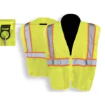 X-CRASH 8V1102H is an ANSI/ISEA, Type R, Class 2 rated vest that combines visibility, functionality, and customization. Two vertical 2″ reflective stripes and one 360º 2″ horizontal stripe add extra visibility. A D-ring pass-through feature ensures that it can be easily tied overhead without having to remove safety vest. Provides left chest and lower right inside pockets to store small essentials. Customization on the back center of the vest is available.